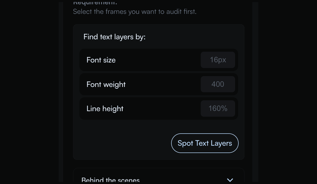 After running the TypeScale audit, you can now use the Spot Text Layers functionality to locate exactly where each audited font configuration is being used across your frames. Select the frames you want to audit, define the font size, weight, and line height, and the tool will highlight every matching text layer.